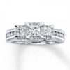 Representing your past, present and future together, this three-stone ring dazzles with a trio of princess-cut diamonds framed in round diamonds as its centerpiece. More round diamonds are channel-set along the band of 14K white gold to complement. The ring has a total diamond weight of 1 carat.